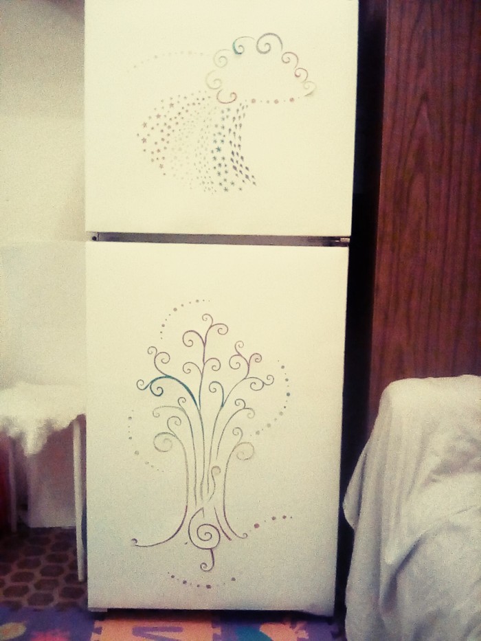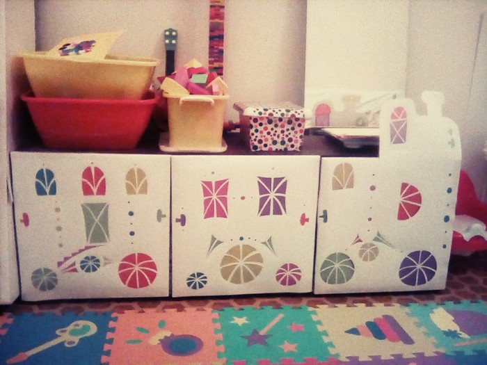 Адаптировала совковые тумбочку и холодильник просто ватманами с заполнением окошек цветными частями скоросшивателей ;)