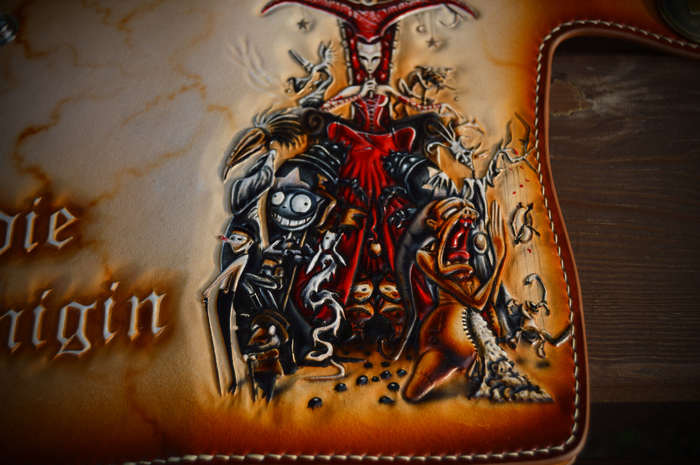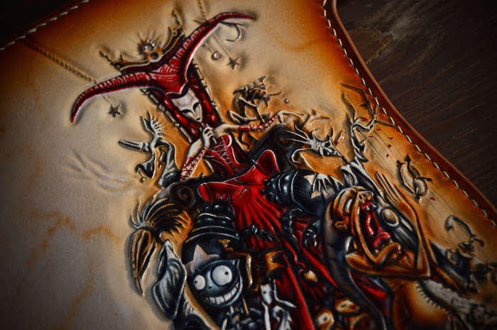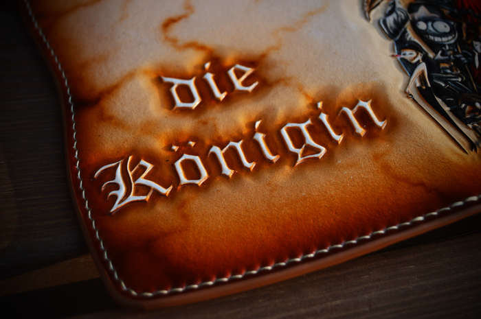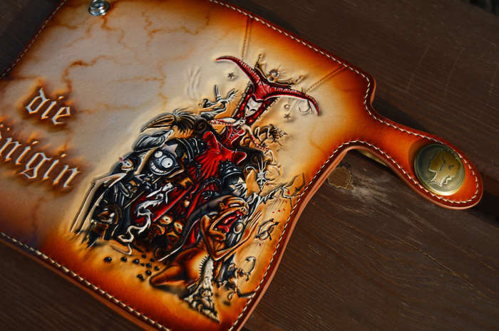 Для обложки второго кошеля использовал кожу растительного дубления такого же типа, как для тиснения, только в толщине 0,8-1,0 мм. На ней же была накатана текстура, деталь покрашена спиртовыми красками от Fiebing черного и красного цветов, текстура выделена с помощью антик геля. Подклад наружной части и все детали внутри — кожа козы в толщине 0,5 мм. Размер этого кошеля 86х120 мм.