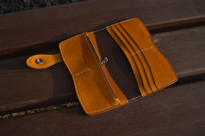 Для первой использовал 3 кожи. Наружная часть: кожа Pueblo oliva, толщина 0,8 мм, кожкартон для увеличения плотности 0,4 мм и в качестве подкладки кожа козы, по-моему Antiba, толщиной 0,5 мм. Детали внутренней части — также коза 0,5 мм в двух цветах. Основной задачей было добиться внутри одной геометрии на блоке карт и на монетнице. Из косяков: на клапане виден бугор от кнопки, установку нужно было делать по-другому( Также вертикальное расположение карт позволило добиться уменьшения размера кошеля (примерно 10х10 см). Собрано всё на нити от Meisi толщиной 0,45 мм, шаг пробойника 4 мм. Краска для уреза Fenice. За счёт тонкой кожи, шерфования и конструкции удалось сделать минимальную толщину урезов (но ещё не предел, есть с чем работать).