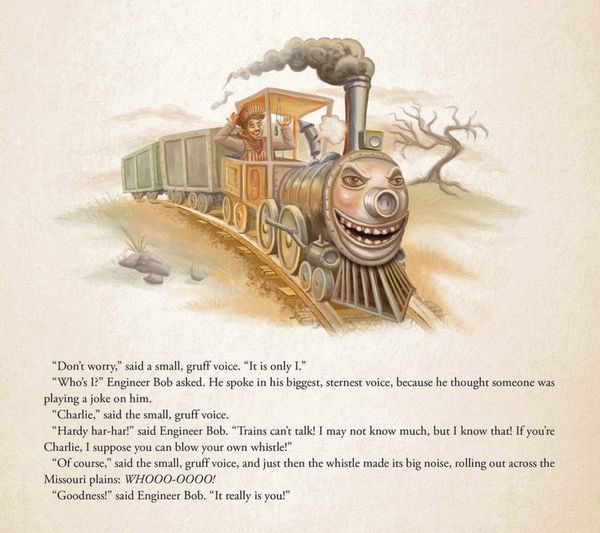 Вот как описано знакомство Джейка с книгой: «— Не задавай мне дурацких вопросов, в дурацкие игры я не играюсь, — пробормотал Джейк, разглядывая последнюю картинку. На ней Чарли Чу-Чу тащил за собой два пассажирских вагончика, набитых смеющимися и довольными детьми, от «русских горок» до «чертова колеса». В кабине, понятно, сидел машинист Боб, тянул за веревку гудка и улыбался — счастья полные штаны. Предполагалось, наверное, что улыбка его выражает великую радость, но Джейку она показалась ухмылкой безумца. Оба, — и Чарли, и машинист Боб, — походили на сумасшедших… и чем дольше Джейк вглядывался в лица детей на картинке, тем явственней ему казалось, что за довольным их выражением скрывается ужас».