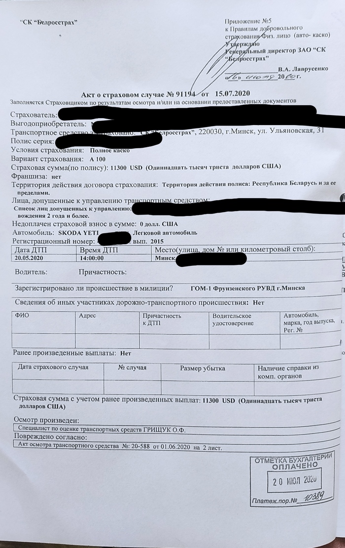 Хозяин Шкоды перезвонил через несколько дней. Поведал, что был он у дилера, оценили стоимость работ, я, в принципе, был готов компенсировать затраты до момента озвучивания суммы. На тот момент это было больше 300$. От такого развития событий я выпал в осадок, у меня просто столько не было, даже в рассрочку это большая сумма (на тот момент мой авто стоил 350$ и нужен был для работы). О чём и сказал владельцу Шкоды, и он обратился в страховую, так как его авто был застрахован по КАСКО.