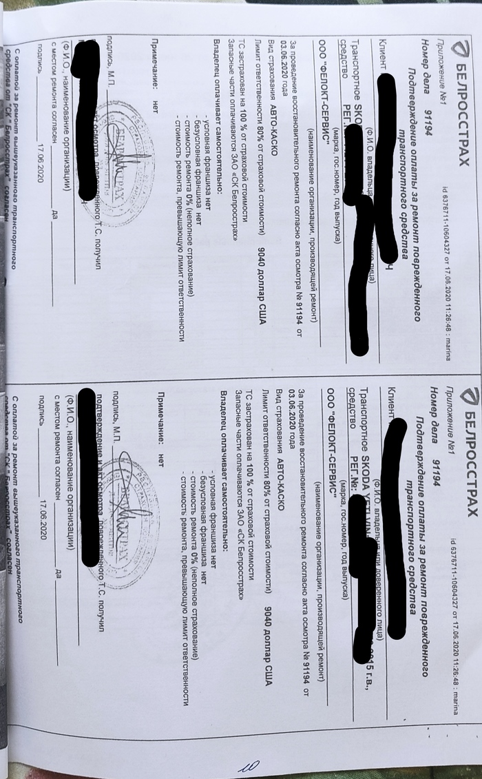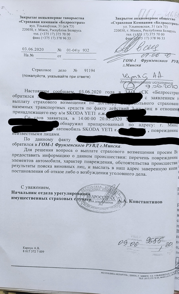 Далее прикрепляю фото всех страниц, что прислали, замазал свои данные и владельца Шкоды. Данные сотрудников БелРосСтрах оставил, пускай видно всем будет героев пофигизма.
