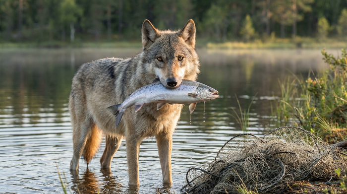 Ученые впервые зафиксировали, как дикий волк использует рыболовную сеть. Вы думаете, волк — это про вой, клыки и бег за оленем?