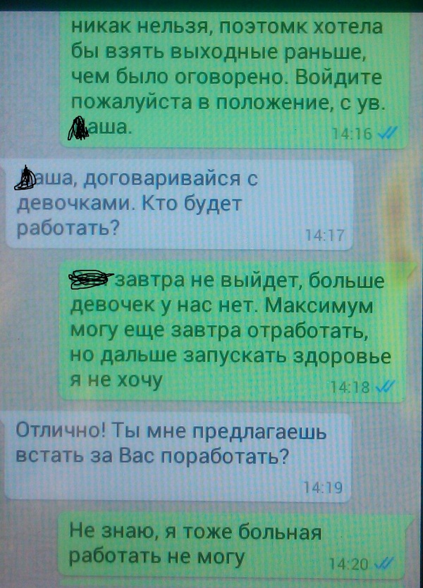Я: я тоже не могу, я за городом... Позвони начальнице, пусть ищет кого на замену, может кого-то из другого магазина...