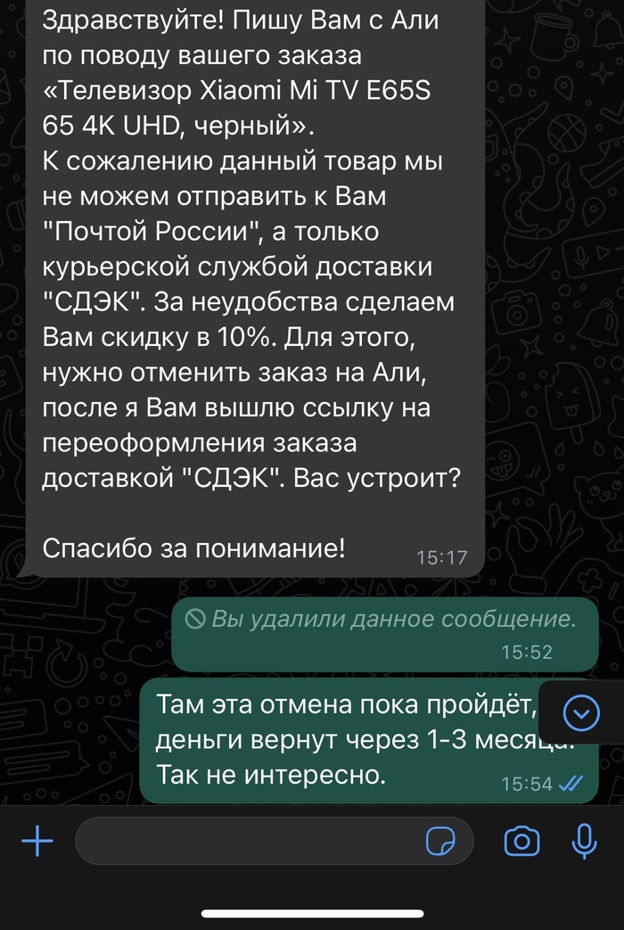 Через пару часов мне написали на ватсап, что данный товар можно отправить только СДЭКом, и мне нужно заполнить форму. Скриншот в конце. Забыл замылить данные.