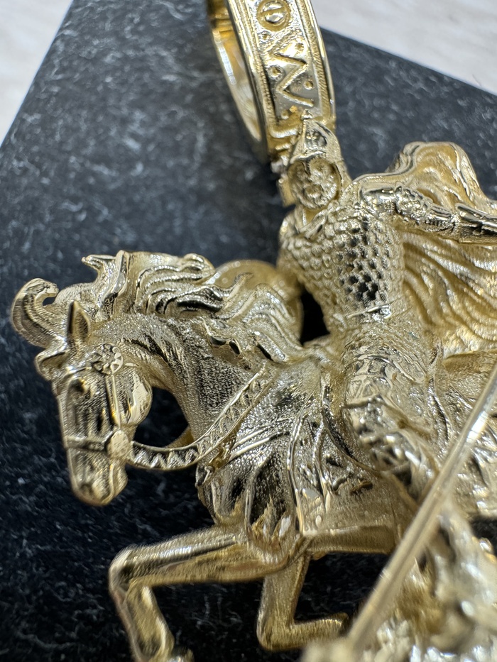 Золотой кулон - Георгий победоносец. Выполнен с разработкой дизайна по запросу клиента.