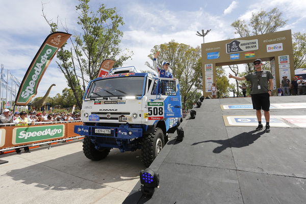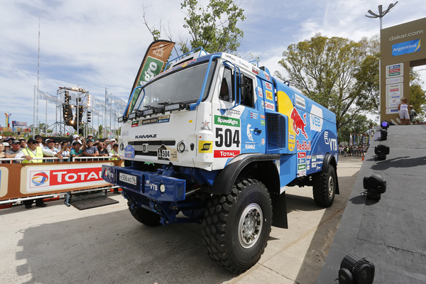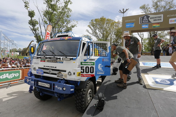 Старт первого участника состоялся в 11:45 по местному времени (разница с Москвой – минус 6 часов). Сначала в сторону Росарио - первого бивуака Дакара - выдвинулись квадроциклисты и мотоциклисты. За ними был дан старт джипам и, наконец, грузовикам. Первый грузовик под управлением победителя прошлого года Айрата Мардеева стартовал в 15:30. Зрители на улицах Буэнос-Айреса, оживленно приветствовали камазовские экипажи - Айрата Мардеева, Эдуарда Николаева, Андрея Каргинова и Дмитрия Сотникова, они выступают соответственно под 500, 502, 504 и 508 номерами.