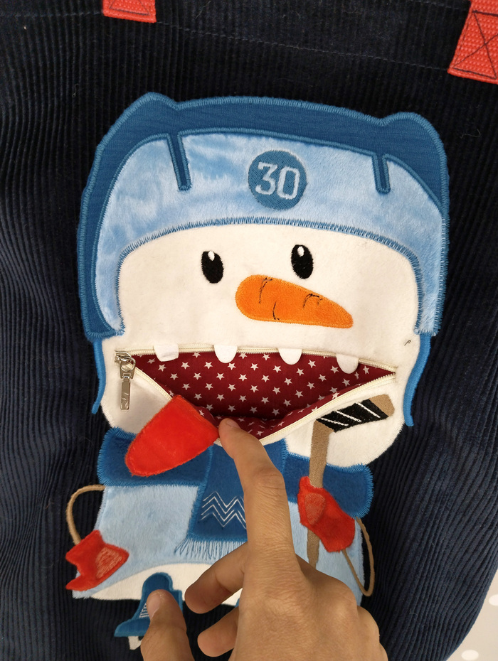 Материалы: Велюр вельбо, проклеенный на термо-прессе с уплотнителем через клеевую паутинку, фетр, внутри подкладка хлопковая ткань. Зубы и когти это плотный фетр, порезанный с помощью лазера. Есть два кармана: один снаружи - это рот, второй внутри кармашек на замке. В главное отделение входит лист А4.