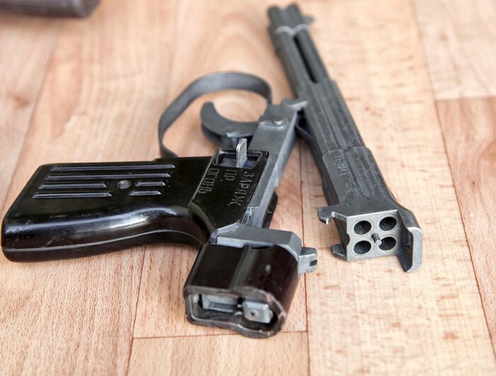 Следующим шагом стало создание уже настоящей боевой системы – револьвера. Оружие было пятизарядным, имело ударно-спусковой механизм двойного действия. Помимо этого, ось барабана револьвера могла выкручиваться, что позволяло относительно быстро сменить барабан на новый снаряженный, в случае если в первом раздутые гильзы застряли в каморах. Кстати говоря, эту проблему Гуревичу так и не удалось решить без ухудшения характеристик боеприпасов.