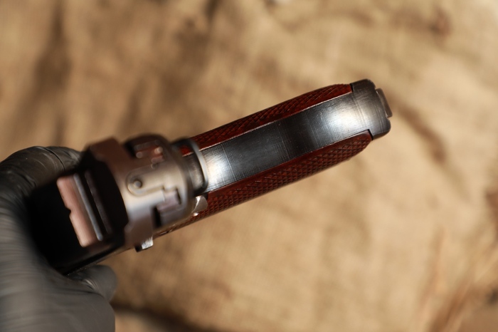 Сам револьвер был достаточно крупный и имел внешний вид не совсем стройный и элегантный, глядя на него, создается ощущение, что оружие слишком загромождено, уж очень большой контраст между самим револьвером и его рукояткой.
