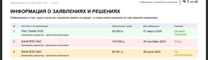 Думаю, ладно, раз обещали, значит, отправят документы. Тут нужно было закрыть кредитную карту ПСБ. Закрыла, а так как документов не дают при закрытии карты и в онлайн-банке ничего не отсвечивает, решила кредитный отчёт снова заказать по прошествии времени, чтобы проверить качество услуги, оказанной ПСБ. А на дворе уже сентябрь, на минуточку. И что я вижу? Всё ещё кредитная карта ВТБ в статусе "На рассмотрении".