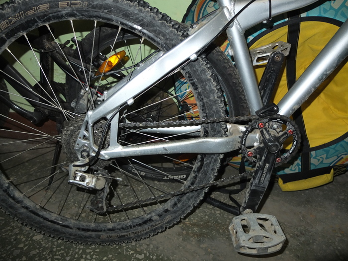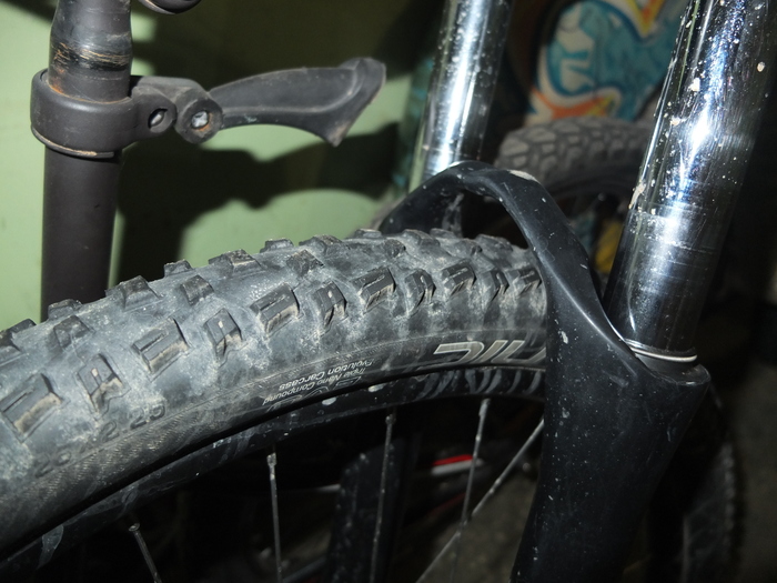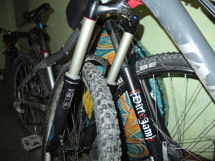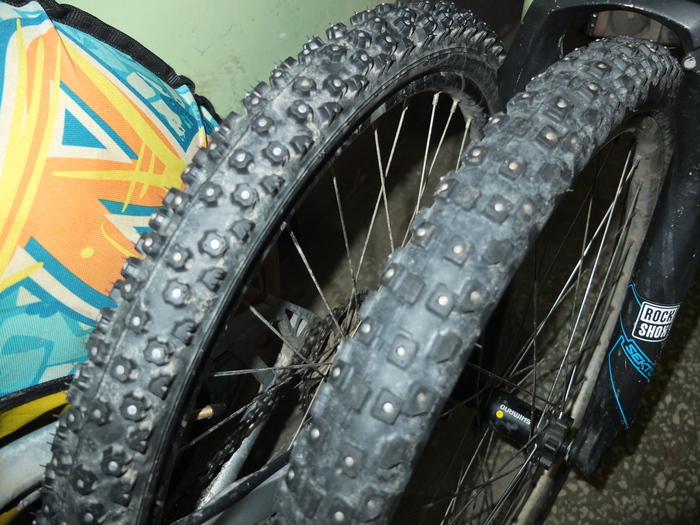 О шипах я обязательно поразмышляю попозже, а если же ваши интересы сводятся к выездам по выходным в лес или к неспешным прогулкам по тротуарам, я бы на вашем месте не смотрел в сторону шипованной резины за over 3000 рублей. Если штатно на ободах натянуты «слики» или «полуслики» подойдут зубастые грязевые кантрийные (не даунхильные!) покрышки нижнего ценового диапазона типа Continental Vertical, Continental Baron или Schwalbe Tough Tom и тому подобные. Наружный слой даунхильных покрышек изготавливается из очень мягкого компаунда, очень «липкий» на грунте он при минусовых температурах становится хрупким как…, в общем имеет тенденцию к превращению в полуслик. У выше перечисленных и им подобных покрышек такой тенденции не наблюдается, так как они одно-двухслойные и жесткие зимой и летом. Один из моих коней обут в Schwalbe Nobby Nic (верхнее фото), позволяет многое. Реально активное зимнее катание требует чуть большей базовой физической подготовки чем летние покатушки, а обычная летняя резина на начальном этапе позволит плавно увеличить нагрузку на организм. Переход на шипы должен иметь вескую причину, и имея даже начальные навыки езды на лыжах (тем более на горных) эту причину не найдешь в 90% случаев данного заболевания. Я оказался 10-м в очереди и на шипы перешел.