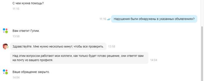 На следующий день я поинтересовался снова. Мне пообещали, что ответят на почту. Но по сей день тишина. Два из указанных объявлений уже закрыты по причине продажи товаров, одно до сих пор висит так и не отредактированное.