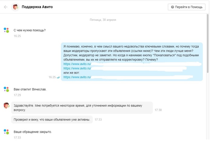 Вопрос я задал на стадии, когда редактировал свое объявление и убирал вышеуказанную фразу. Вы поняли, да? Техподдержка даже не читала мой вопрос. Даже не смотрела те объявления, которые я скинул. Просто отписались, что теперь-то с моим объявлением все в порядке.