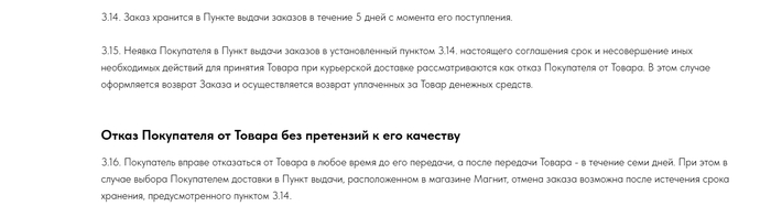 Пишем там вопрос об отказе и получаем ответ : "Фиг Вам, а не отказ в ЛЮБОЕ время, ждите 5 дней пока товар будет в пункте выдаче (магазине Магнит)