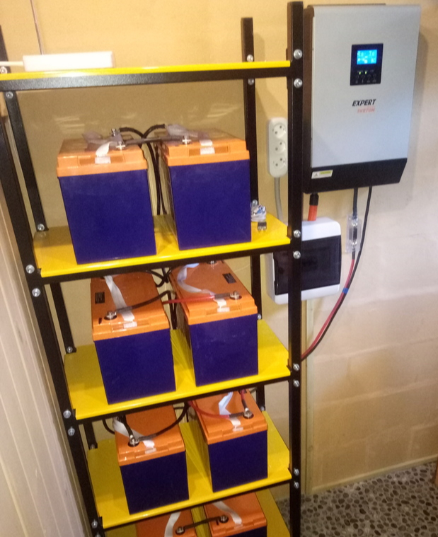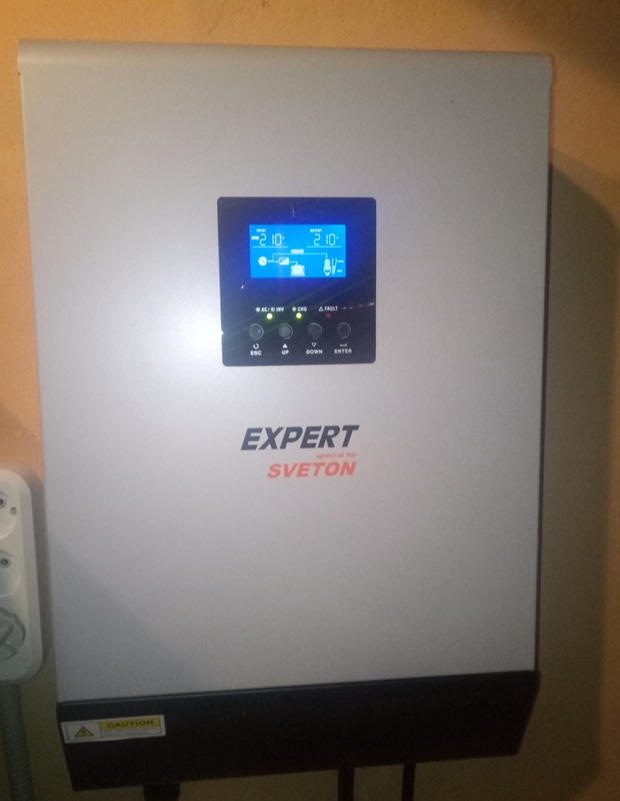 Далее бесперебойник. Выбор пал на изделие Sveton серии Expert мощностью 5 кВт (сейчас есть новые серии). Питается он от двух блоков батарей в параллели , состоящих из четырех последовательно включенных гелевых 12-вольтовых аккумуляторов Delta емкостью по 100Ач. Гелевые батареи хоть и дороже, но настоятельно рекомендованы из-за ряда ценных свойств - они не боятся глубокого разряда, у них увеличено число циклов перезаряда (срок службы доведен до 10 лет), они хорошо переносят морозы, что для дачи может быть крайне актуальным, если дом не используется зимой.