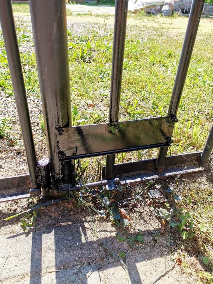 Заодно покрасил Хаммерайтом весь забор, а то в районе ворот он новый и глянцевый, а дальше матовый и местами покоцан:)