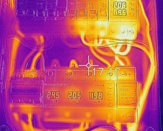 С учетом ограничения "15кВт на участок" основной ввод выполнен сечением 6мм.кв, нагруженные цепи по 4, остальные 2.5 квадрата. На всякий случай подал нагрузку и посмотрел тепловизором - проводка ок, а одного предателя из автоматов впоследствии заменил. Кстати, всем, кому предстоят такие работы, крайне рекомендую обзавестись наконечниками и обжимными клещами, сокращают время и усилия на порядок.