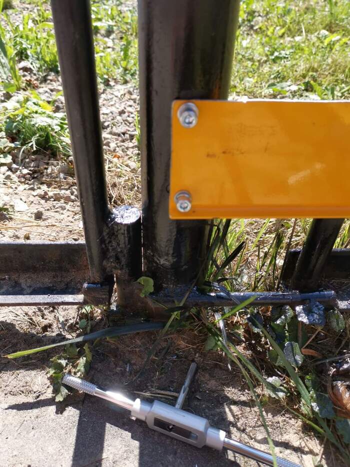 Выбираем схему открытия в инструкции (у меня наружу) и, сверяясь с размерами, определяем места креплений крепежных скоб. Так как у меня забор из прутьев, пришлось делать из 2-х миллиметровой стали площадку под скобу. Варить силовые элементы не стал, всё на резьбовых соединениях, резьбу резал прямо в стальном заборе метчиками и крепил Torx из нержавейки с пружинными шайбами.