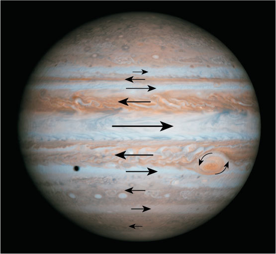 Юпитер знаменит своими красно-белыми полосами — облаками движущегося газа в нижней атмосфере Юпитера. Вблизи полюсов астрономы наблюдают яркие полярные сияния, которые ассоциируются с сильными ветрами в верхней атмосфере планеты. Но вот структуру ветра между этими слоями отследить не удавалось.