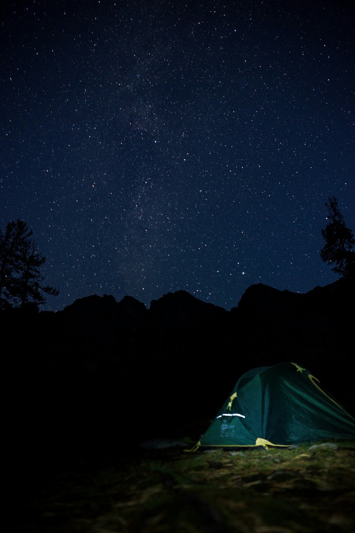 Добравшись до озера Художников, поставив палатку начался дождь, который лил весь вечер и весь следующий день, который мы хотели провести в походах на легке до водопада и погулять в долине реки Тайгиш, но вместо этого мы весь день просидели в палатке, а ночь... Ночь выдалась звёздной :)