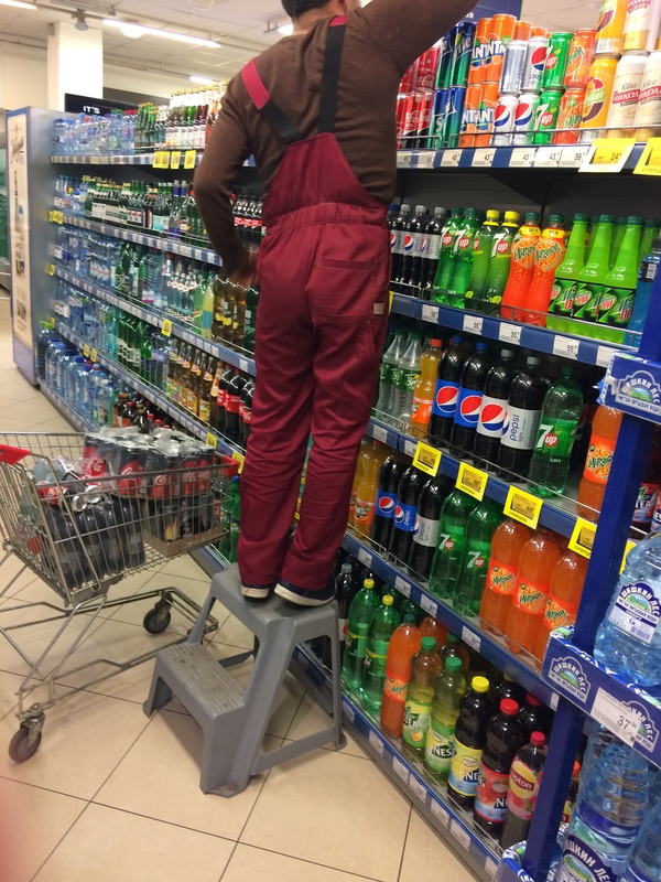 Сотрудник поправлял товар и как только добирался до верхней полки, вот так вот забирался. Много фото делать не стал, на этом фото и так все понятно.