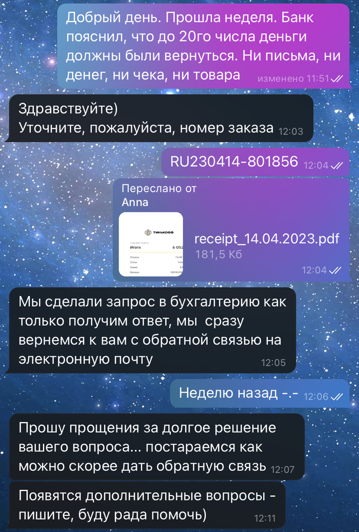 Пишу через пару часов, меня уверяют, что отправили запрос в бухгалтерию и по итогу напишут мне на почту. При этом, заказ поправили, и теперь он придёт одновременно с игрушкой, и я должна его оплатить при получении (на 500 рублей больше). Здорово...