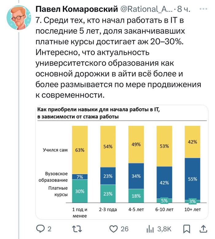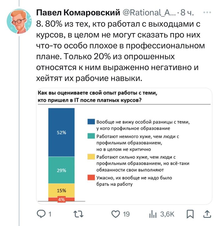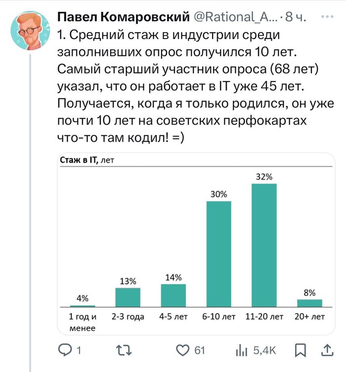 28 razbudimenya 1 год назад Баяны Примерно 20% джунов врут в резюме Парень опросил айтишников о работе и составил огромный тред с результатами.Не завидуем. Показать полностью 10 X (Twitter) Скриншот IT Джун Тред Длиннопост Ещё 0