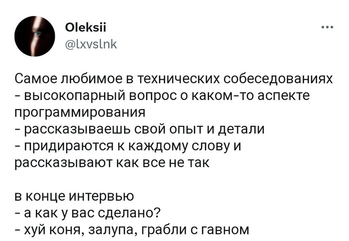 2019 razbudimenya 2 года назад Twitter Самое любимое IT IT юмор X (Twitter) Скриншот Собеседование Мат 23 2 Ещё 0