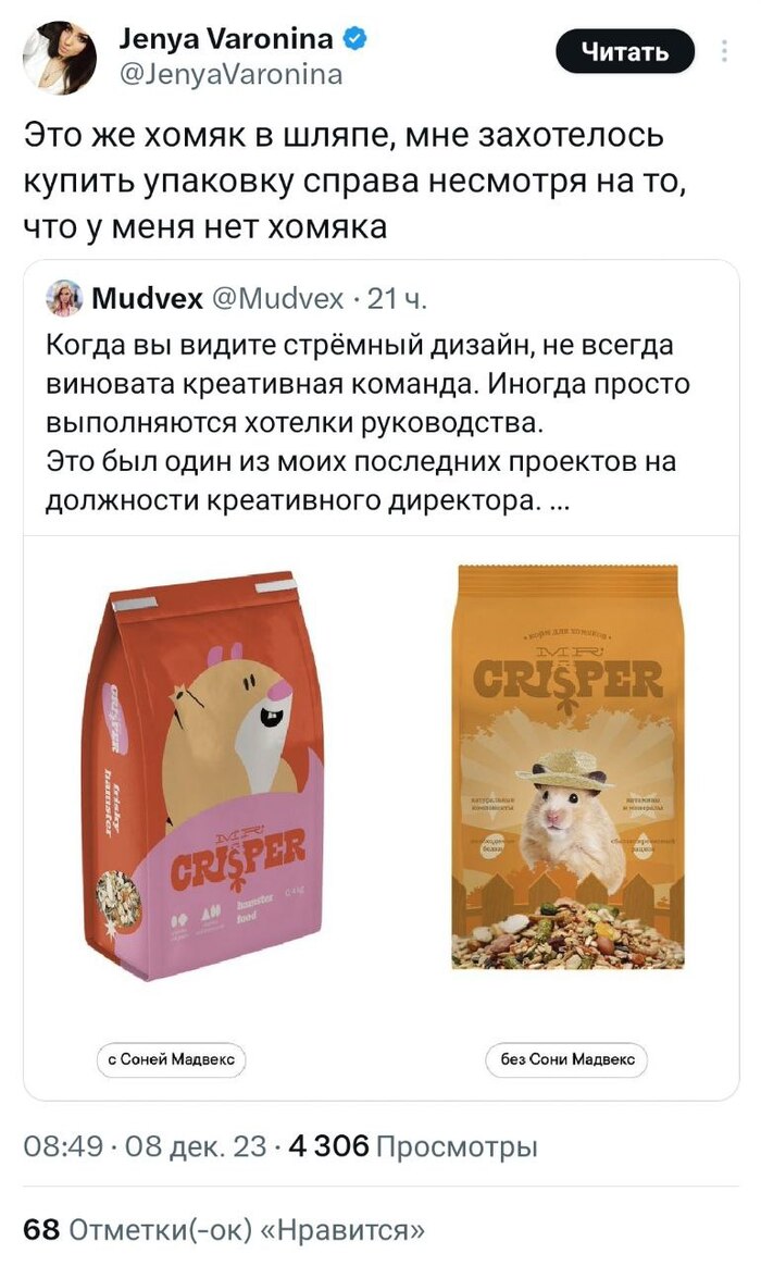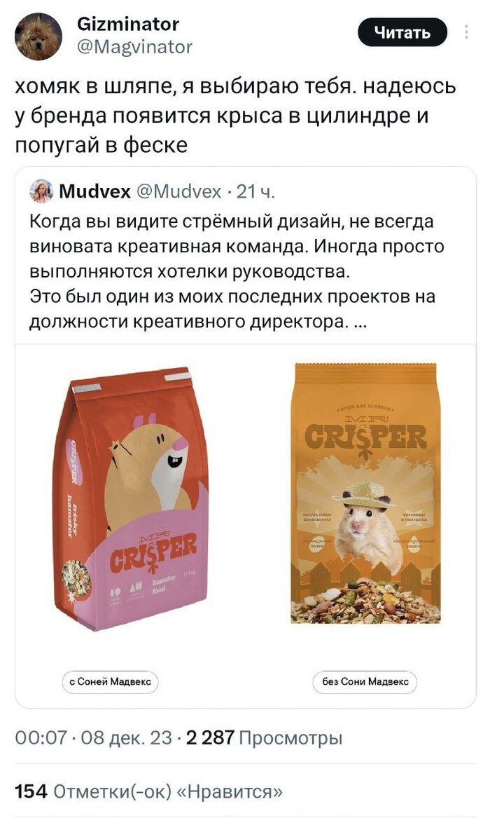 Арт-директор в Твиттере пожаловалась, что её концепцию упаковки для хомячьего корма завернули и приняли вариант с хомяком в шляпке.