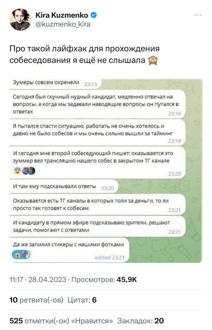 4226 razbudimenya 2 года назад Twitter Эйчары раскусили ещё одну ловушку1 Показать полностью 1 X (Twitter) Скриншот Работа Собеседование Лайфхак Помощь 111 19 15 3 2 Ещё 0