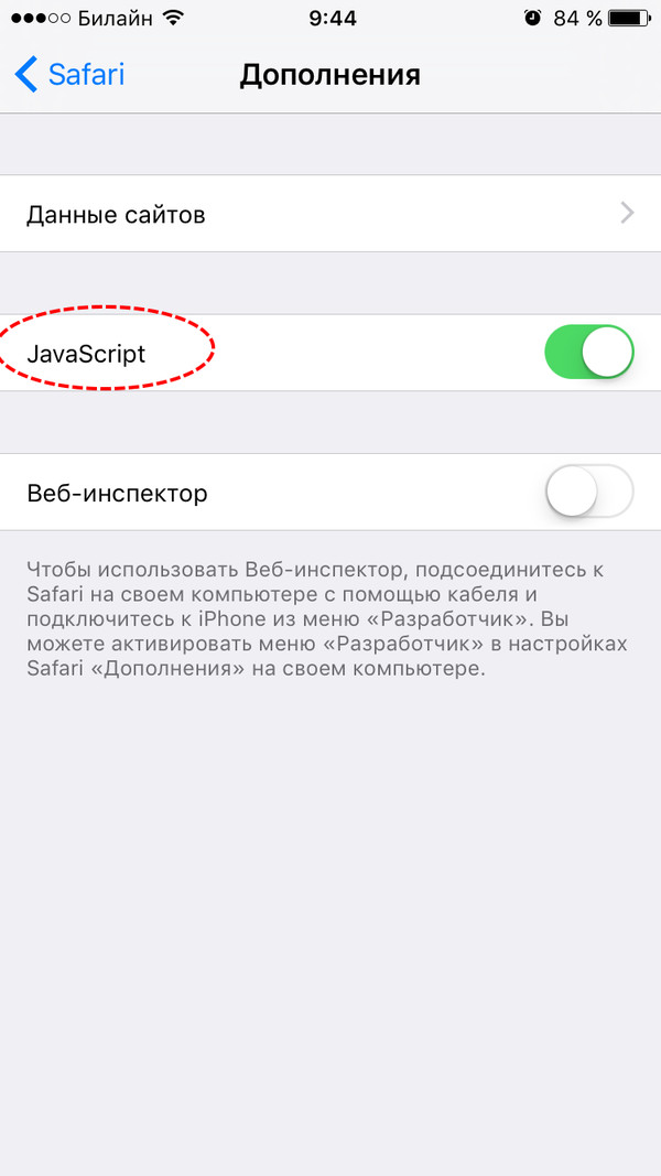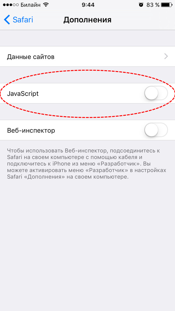 4) Заходим. Видим настройку "JavaScript" и отключаем ее.