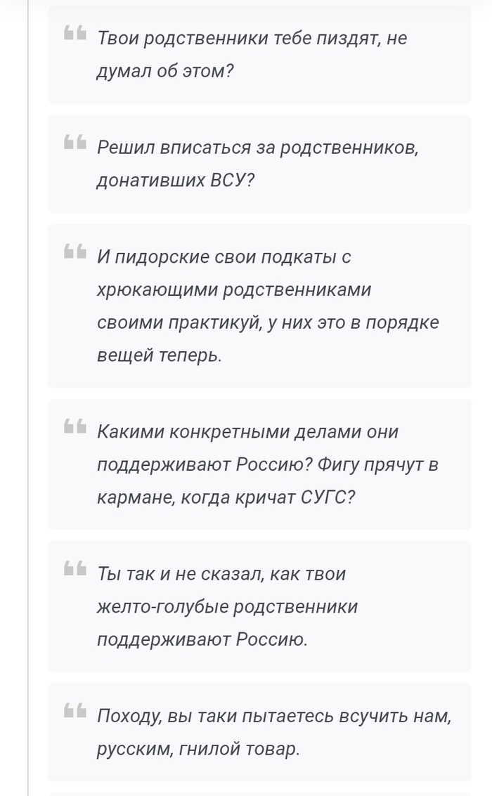 Одним из триггеров русского противостояния украинству, наряду с пророческим строками поэтессы Дмитрук "Никогда мы не будем братьями"(именно строками, ибо всё стихотворение явная лажа!) стал лозунг украинских националистов "Москаляку на гиляку", не осуждённый публично ни политическим руководством, ни украинским обществом, а значит - молчаливо ими одобренный.