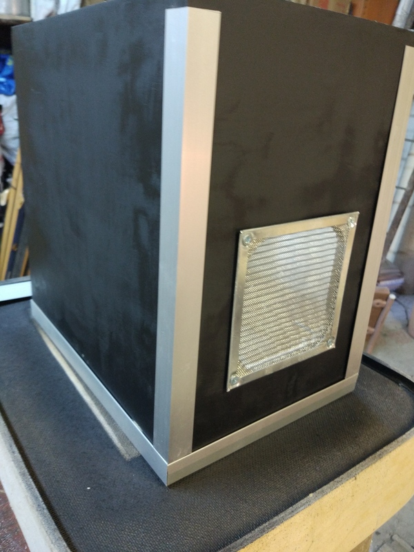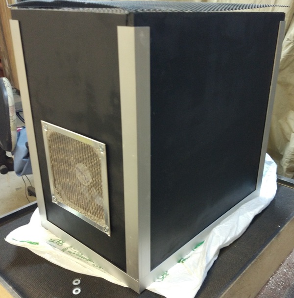Грани "кубика" я оформил алюминиевым уголком. Пилил ножовкой с помощью стусла. Дырки для вентиляторов 120*120 закрыл пылевыми фильтрами.