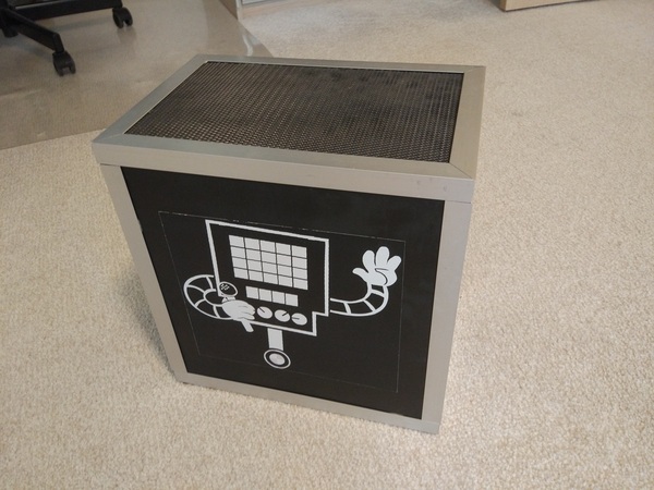 Далее изготовил крышку из металлической сеточки и тех же уголков. Крепил на жидкие гвозди. На бок распечатал картинку на самоклеящейся бумаге. Вот что получилось.