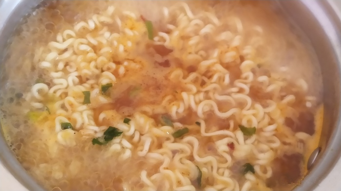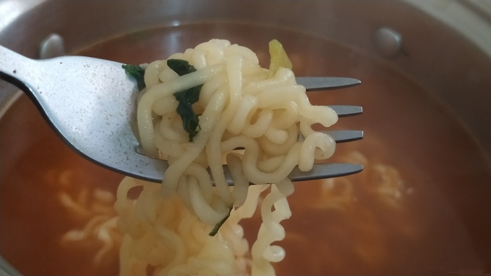 Пробуем рамен: осторожно, испытывая некий трепет (содрогание), предвкушая, готовясь... Лапша плотная, приятно жуется, соус сладковат, вполне вкусный. Сейчас должно накрыть. Сейчас станет больно, сейчас я пожалею. Аспиранты нервно переминается с ноги на ногу: один со стаканом молока в руках, второй с блокнотом и ручкой. Но... Проходит 10 секунд, двадцать...
