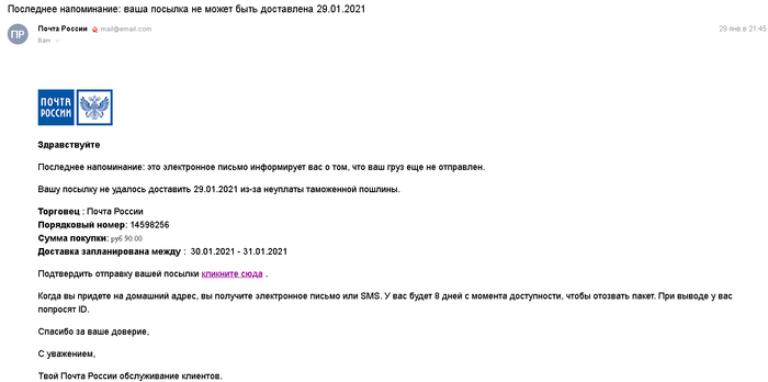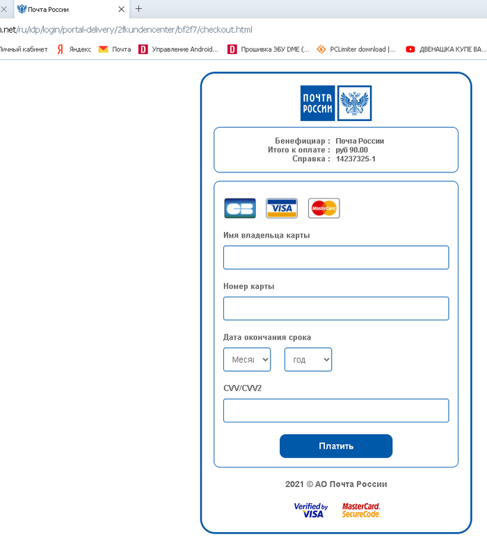 Получается вроде как нужно ввести данные своей карты, и с вас спишут 90 рублей таможенной пошлины, и вы получите долгожданную посылку! Но это не так, это развод! Я честно даже не пытался вводить какие либо данные, не знаю что случиться после нажатия кнопки Оплатить, может с вас попытаются списать 90 рублей, а может просто сохранят данные вашей карты, а скорее всего и то, и другое.