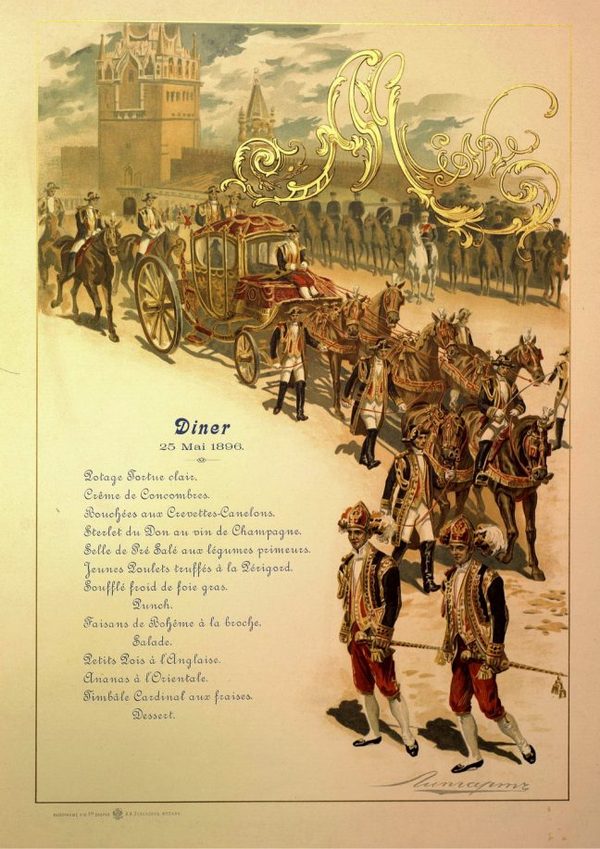 «Надо сказать о меню обеда, лежавшем перед каждым прибором. Меню исполнено по рисунку профессора В.М. Васнецова и представляет пергаментный свиток около 1/2 аршина длиною. В титуле славянской вязью вершкового размера изображена надпись: “Священное коронование на царство государя императора Николая Александровича и государыни императрицы Александры Федоровны”; под этой надписью — огромные вензеля их императорских величеств, увенчанные императорскими коронами.Вензеля упираются в бордюр древнерусского узора, в который включена художественно написанная сцена: “Венчание Михаила Федоровича на царство”. Картина написана по оригиналу, хранящемуся в Оружейной палате; на заднем плане картины высятся главы Успенского собора. Под этой картиной, в орнаментах, — три двуглавых орла различных эпох прежнего времени, отпечатанные разными красками на разных фонах. В треугольнике, который образуется этими орлами и украшающими их заставками, напечатано древнерусским рукописным шрифтом самое меню, текст которого приблизительно расположен в таком порядке:
