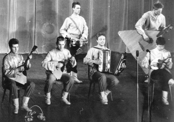 Под текстом меню — древнерусские заставки и, между прочим, фигура гусляра, и в этих заставках помещен славянскою вязью (заглавные буквы отпечатаны киноварью) следующий текст: