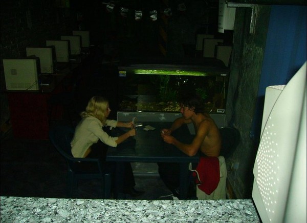 Ночная жизнь в клубе так же была разнообразной - иногда приходил всего 1 игрок и играл всю ночь, а клуб работал, иногда приходили совсем взрослые игроки, легко выпивали ящик пива и утром уходили на работу. Ночью в клубе происходило всякое, на фотке парень играл с девкой в карты на раздевание.