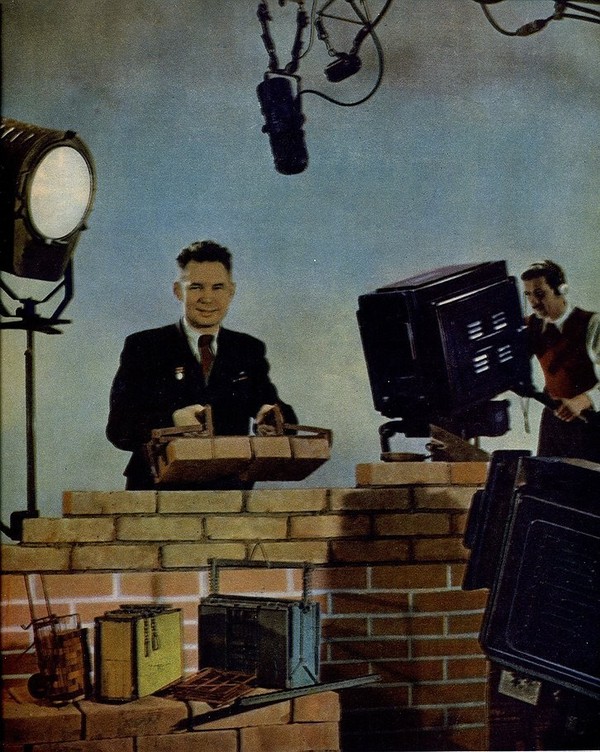 В студии Центрального телевидения лауреат Сталинской премии Фома Иванович Мальцев демонстрировал в студии сконструированные им приспособления для каменщиков.