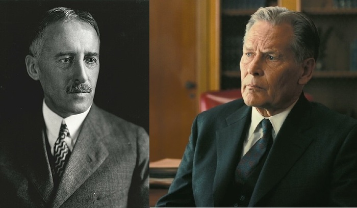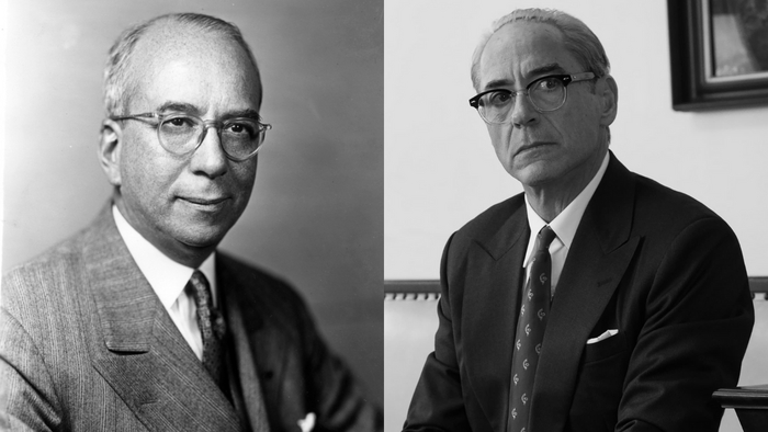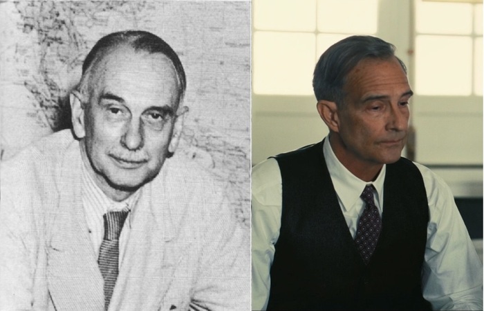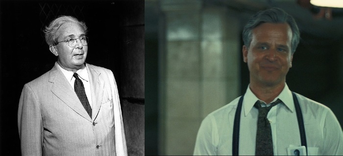 Льюис Штраусс (актер Роберт Дауни мл. ака Тони Старк, Шерлок Холмс, Чарли Чаплин и Кирк Лазарус из Солдат неудачи) — американский бизнесмен, филантроп и контр-адмирал, который два срока проработал в Комиссии по атомной энергии США (второй срок в качестве председателя). Сыграл важную роль в разработке ядерного оружия, ядерной энергетической политике США и развитии ядерной энергетики. Был членом исполнительного комитета Американского еврейского комитета и ряда других еврейских организаций, пытался изменить политику США, чтобы принять больше беженцев из нацистской Германии, но безуспешно.