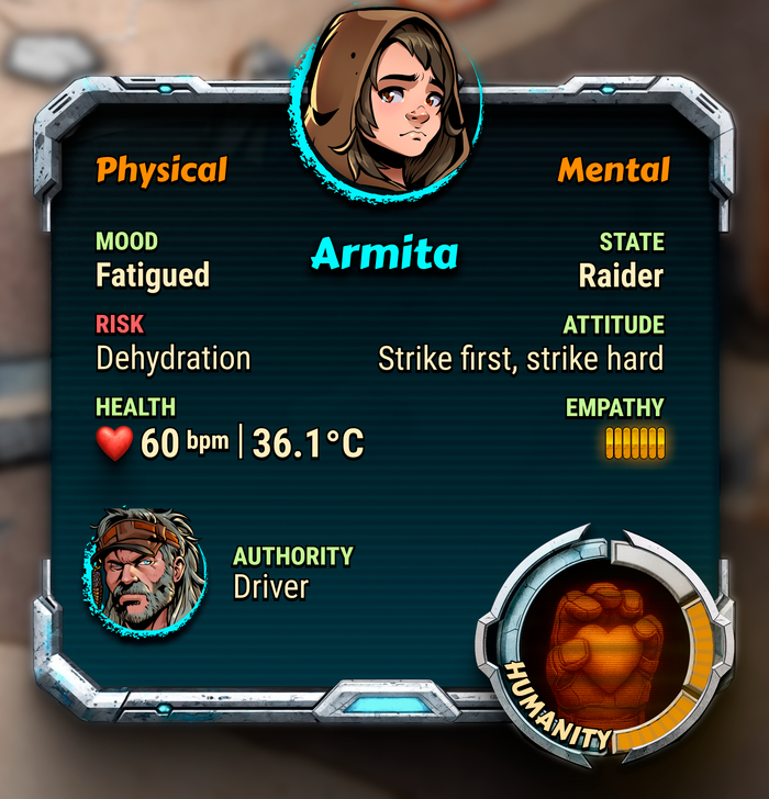 У Роберта Шекли есть постапокалиптический рассказ «The Girls and Nugent Miller» («Девушки и Наджент Миллер»), написанный ещё в 1960-м году. Этот рассказ, серия фильмов о безумном Максе (где он из защитника превращается в бесстрастного воина), а также игры про киберпанк (где от чрезмерного числа имплантов у человека происходит киберпсихоз) показывают нас сходное явление — ожесточение. Когда человек начинает утрачивать гуманистические черты, скатываясь в эгоизм, отсутствие эмпатии и тягу к насилию.В нашей игре этот процесс отражен в виде шкалы Человечности, у которой есть 4 деления — Добряк, Выживала, Рейдер и Зверь. Ладно, еще есть пятая, Пожиратель (как в сериале Firefly), но это уже неигровой персонаж.