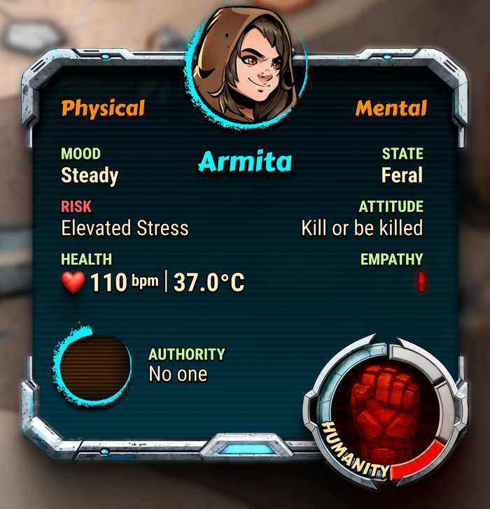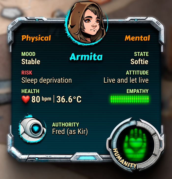 А внутри игры эта идея поддерживается механикой: у нас будет отдельный "виджет человечности", где игрок от лица Фреда может смотреть состояние Армиты: уровень человечности, настроение, пульс, и т.п. Этакая упрощённая версия великой игры "Princess Maker 2", но встроенная в рогалик.