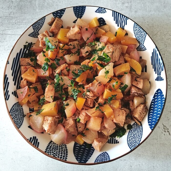 По данному поводу он был зарезан крупным кубиком и отправлен жариться в сковороде вместе с нарезанной варёной индейкой. После того, как появилась корочка, к ним присоединились манго, соевый соус и вода. Дальше на слабом нагреве тушилось всё это под крышкой около двадцати минут.