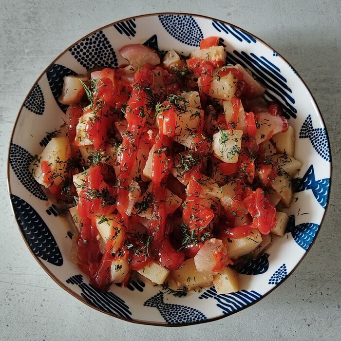 Интереса ради приготовила ещё один вариант, потушила с картофелем и сладким перцем в сметане с горчицей. Это тоже очень даже ничего, но настолько нейтрально, что пришлось добавить кетчуп.