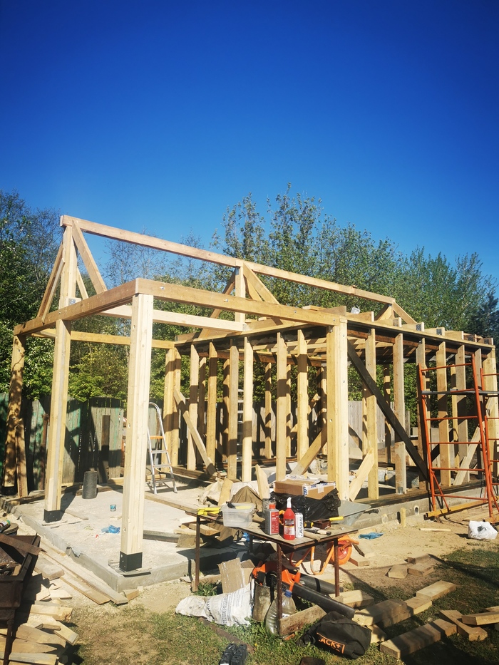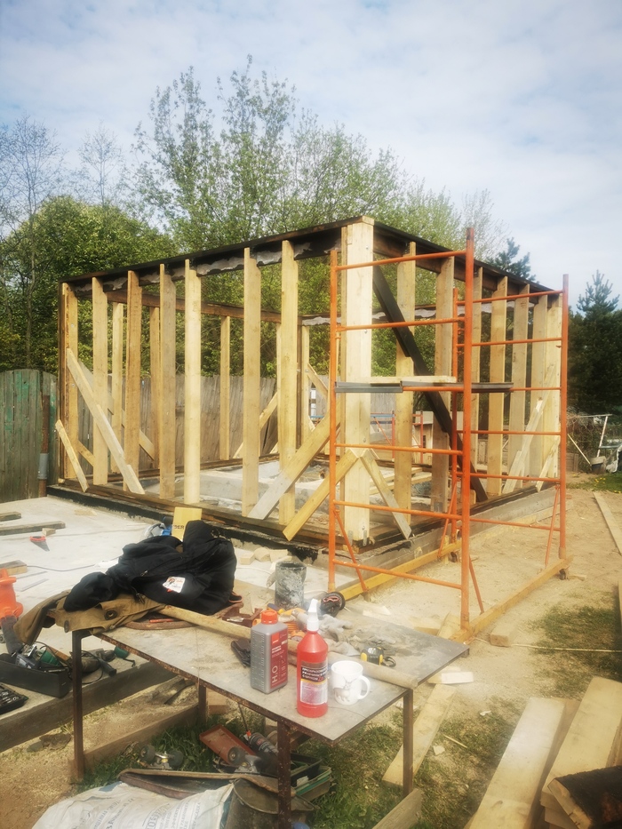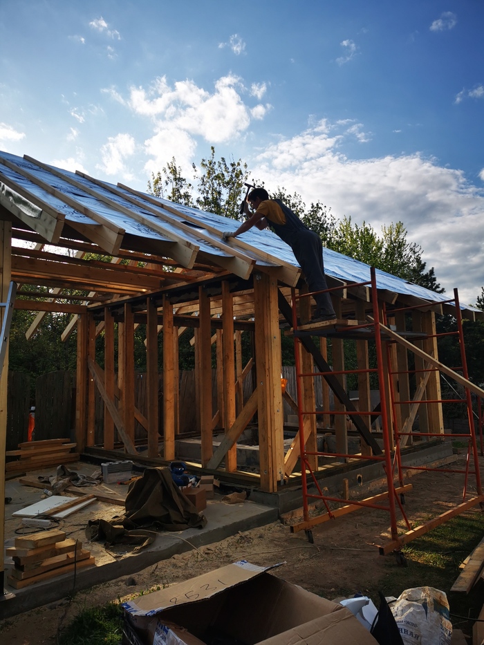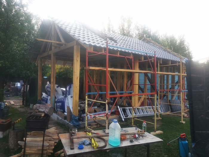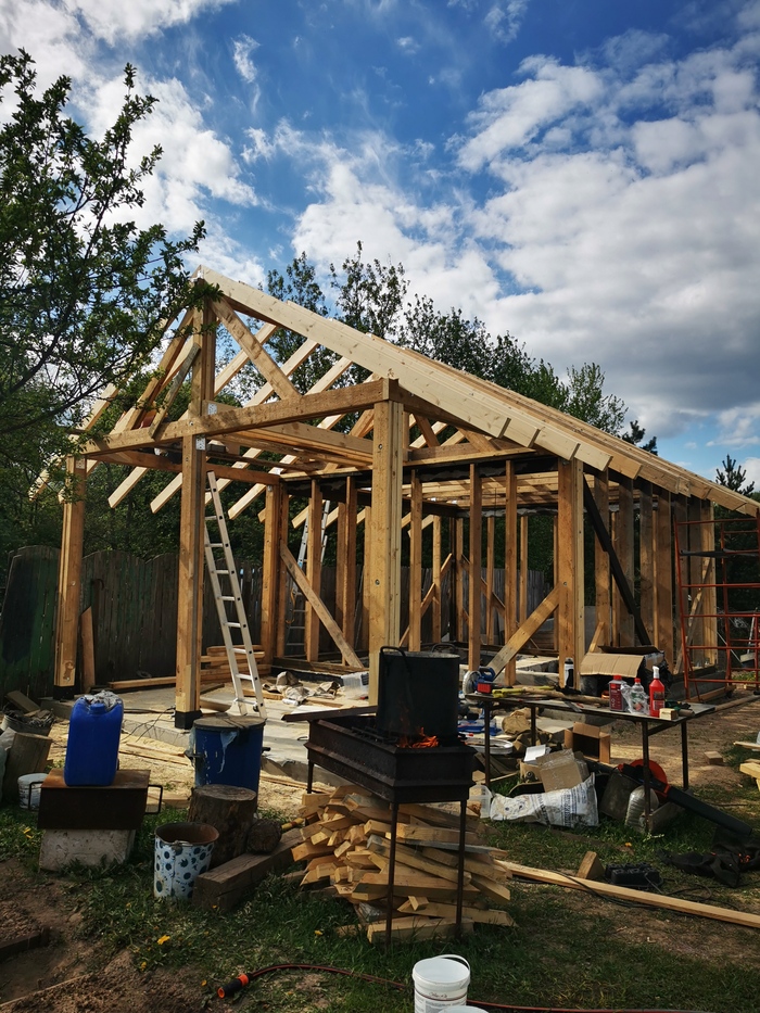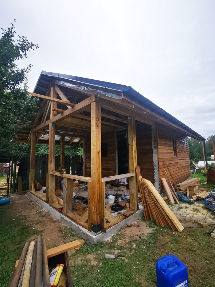 все лето и осень по выходным строил,возвел стены, террасу обнес мягкими окнами, дабы защитить пространство от осадков зимой и осенью.
