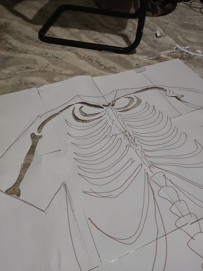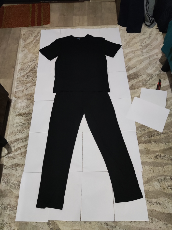 Я почему-то решил, что нужно пойти по пути приклеивания вырезанных деталей из белой ткани. Сказано-сделано, в магазине тканей куплен погонный метр белого флиса, а так же по совету продавца некая "паутинка", которая склеивает тканевые элементы путем нагревания их утюгом. Придя домой со всем этим добром, до меня дошло осознание , что на вырезание из ткани всех элементов костюма, а затем их приклеивание через паутинку мне не хватит даже ночи! На часах было уже 21:00, надо было что то предпринимать, пока не закрылись последние магазины. И вот только в этот момент пришла идея с краской.Так как все магазины с краской для нанесения на ткань были уже закономерно закрыты, принято волевое решение красить балончиком через трафарет.