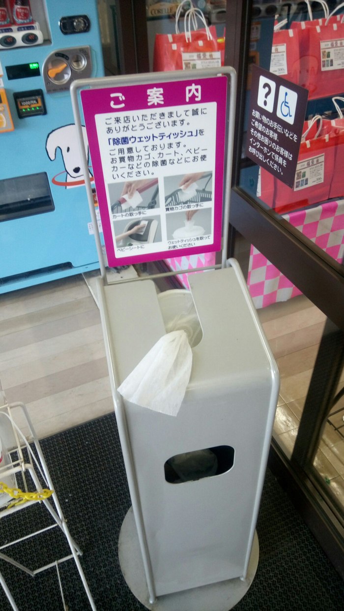 Сервис японских супермаркетов не перестаёт удивлять. Видно, что маркетологи без дела не сидят и придумывают, как всячески завлечь покупателя в магазин. Хозяева заботятся о клиентах, а те в свою очередь несут именно им свои деньги. В некоторых кафе и супермаркетах, в которых расположены кафе, на входе можно увидеть ёмкость с дезинфицирующим средством для рук.