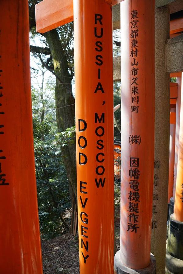 Потом пошли смотреть Фусими Инари. Дорога в гору, проход весь в красных арках. Любой желающий может отвалить кучу бобла, и поставить эту арку со своим именем, чтобы в будущем было благополучие в бизнесе.